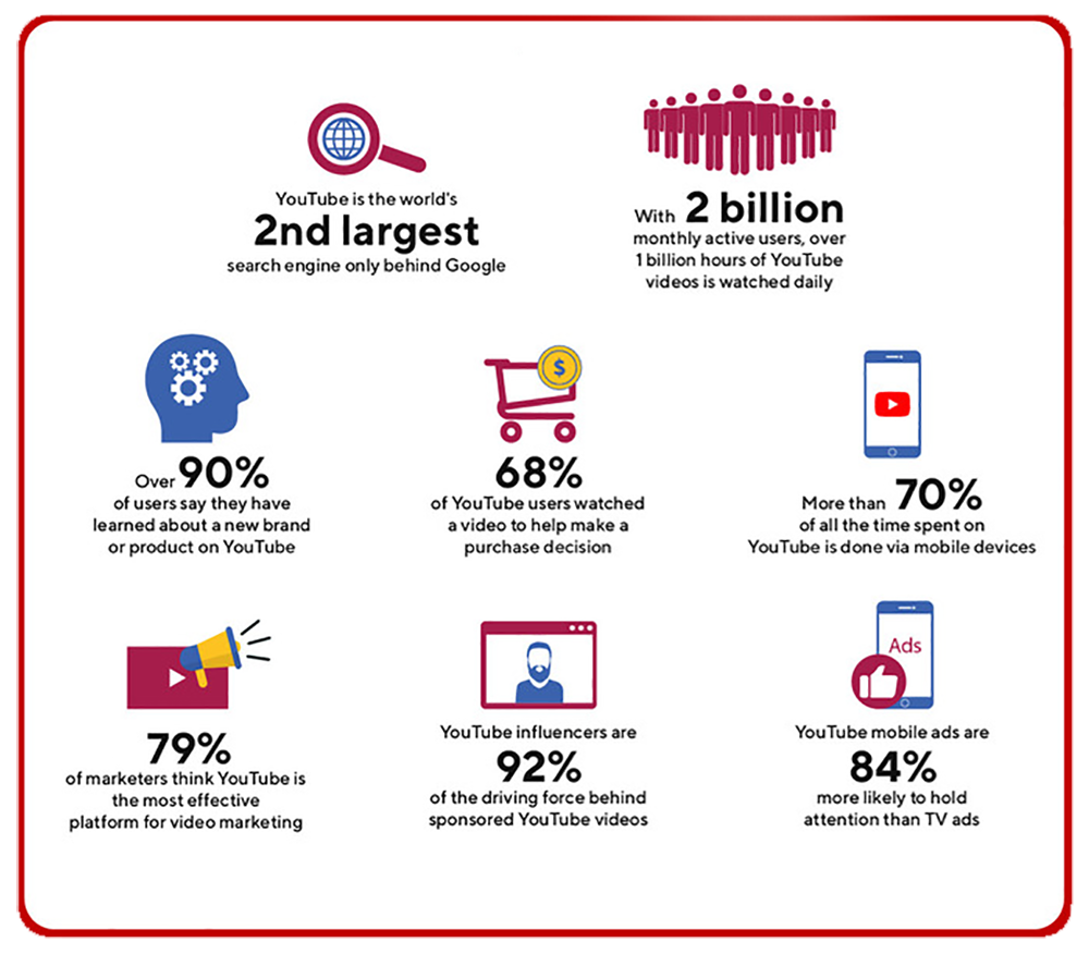 It was not expected from the YouTube to revolutionize the world of online visual content It skipped being just a tool for watching fun and entertaining videos, and became a tool of increasing interest to marketers for use in e-marketing and sales. Internet audiences spend a third of all their web activities watching YouTube videos, It has more than 1 billion users and supports 76 global language. Which represents 95% of the world's population, YouTube is arguably the king of visual content. is the second largest internet search engine, allowing branding owners and marketers to display their products in unique ways that are easy for consumers to understand and share. How can this effective tool be used to maximize marketing and sales development results?