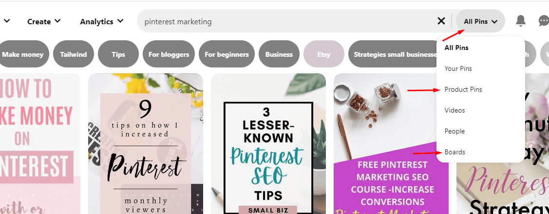 You can search for photos related to products only by choosing Product Pins or looking for Boards photosets or paintings, from which you can study the most iconic collections, and leverage them in designing your own.